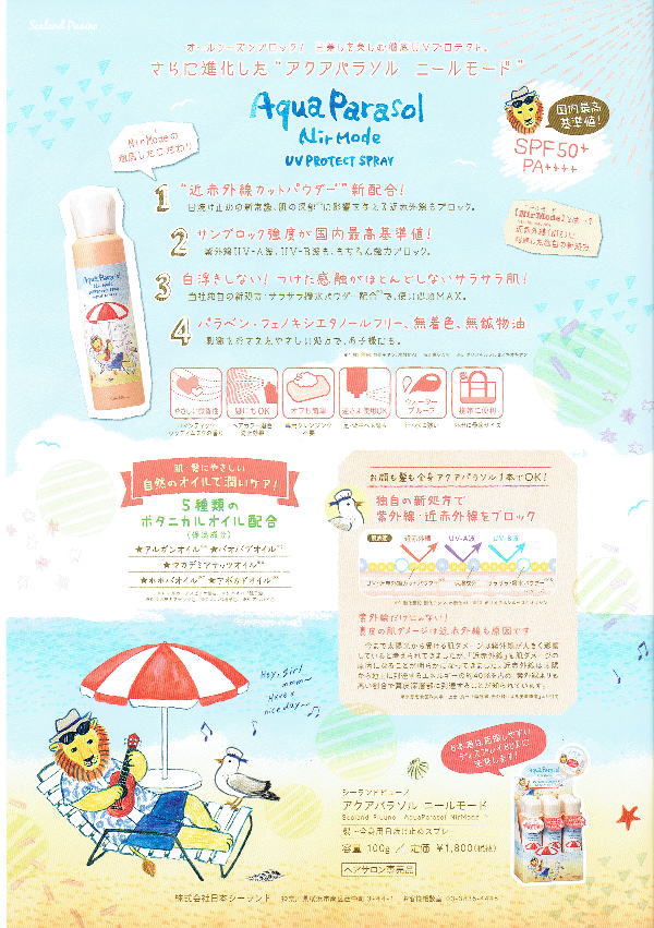 「アクアパラソル」 スプレータイプのUVカットです。 髪の毛~お顔~手足 全身どこでも UV対策出来ます。 白浮きしませんし、パウダータイプなのでサラサラの使用感です。 香りも微香性で 学生さんでも使用できるレベルです。 紫外線をブロックするだけではなくて、お肌に有害といわれている近赤外線までカットします。 1本100g 1,800円(税別) 詳しくは、下記のパンフレットでご覧くださいね。